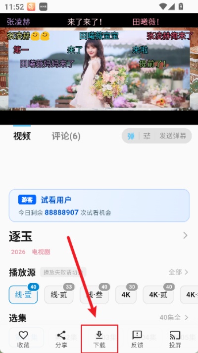 2、进入播放界面后,在下方功能区域找到“下载”选项并点击进入下载设置。