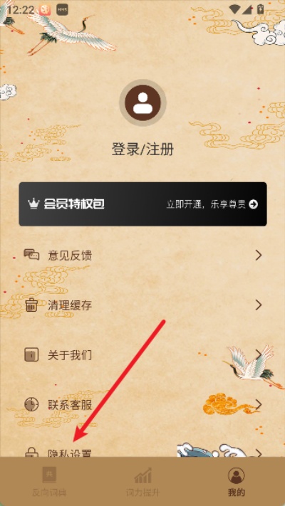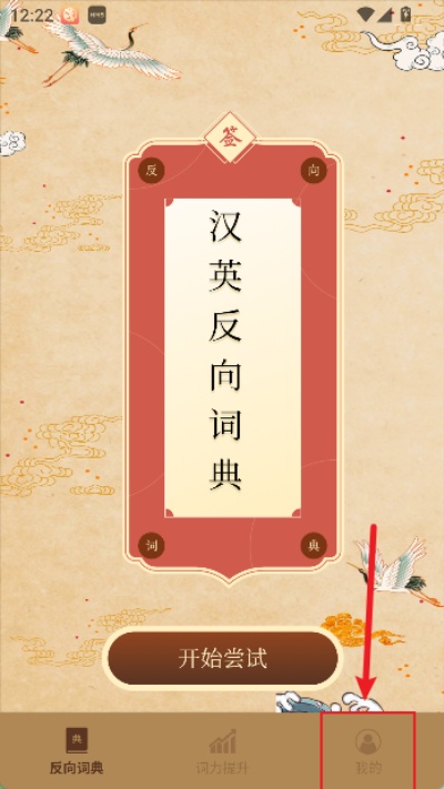 1、打开反向词典应用,在主界面下方右侧找到“我的”并点击进入个人相关页面,进入后可查看账户与功能设置相关选项。