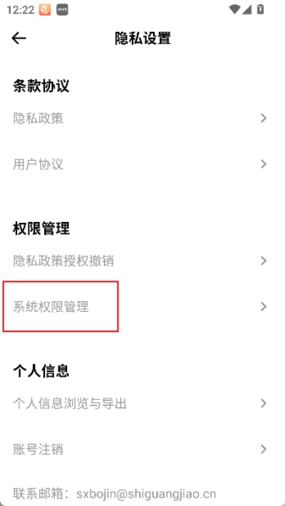 3、进入隐私设置后,在权限管理区域内选择“系统权限管理”,用于查看当前应用所涉及的系统级权限配置情况。