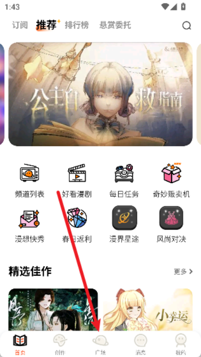 1、进入应用后点击底部广场入口进入内容浏览页面查看相关板块信息。