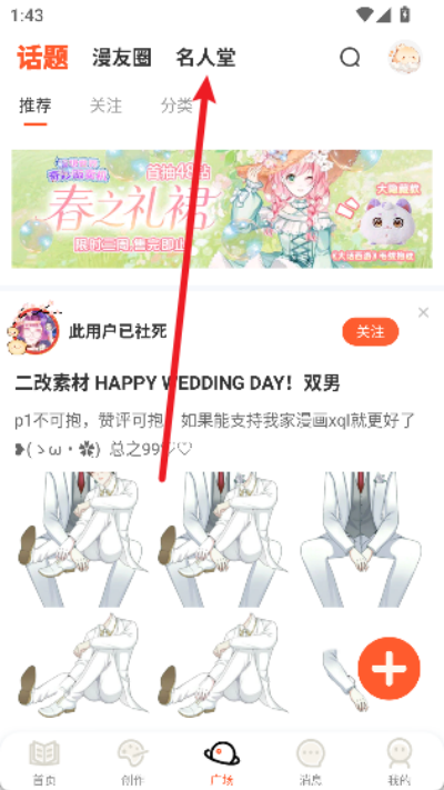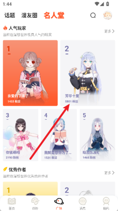 2、在广场页面中找到名人堂入口并点击进入人气创作者展示专区页面。