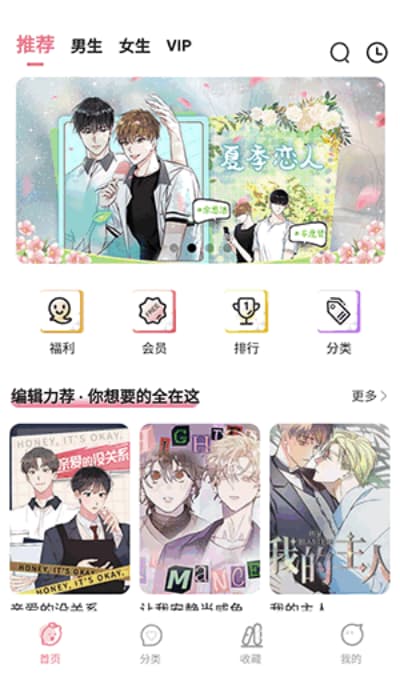 1、进入软件首页后,可在推荐区及男生、女生频道中浏览各类漫画内容,快速获取不同类型的精选作品。