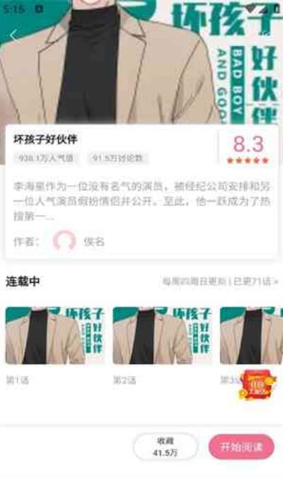 3、进入漫画详情页后,可查看作品简介、热度数据及评分情况,确认后点击“开始阅读”进入阅读模式。