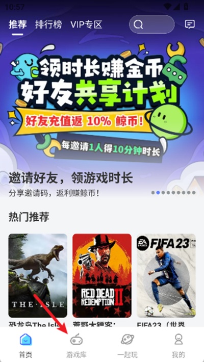 1、打开鲸云漫游软件进入主界面,在底部或页面中找到“游戏库”选项,并点击进入游戏资源列表页面。
