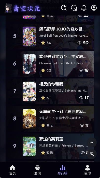 青空次元作为一款专为二次元忠实爱好者量身定制的全方位动漫资源整合平台,致力于打造一个纯净且高效的数字化追番乐园。这款软件通过深度聚合海量优质番剧、热门国漫以及经典剧场版资源,为用户呈现出极其丰富且高水准的视听盛宴。应用内部采用了先进的流媒体分发技术,确保在各类网络条件下均能实现超高清画质的流畅播放,彻底消除卡顿困扰。简洁直观的界面设计配合精准的分类标签,让寻找心仪作品变得轻而易举,同时实时更新的排期系统能够精准捕捉全球动漫动态。其独具特色的社区互动模块与个性化收藏功能,更是将追剧体验提升到了全新的维度,让每一位动漫迷都能在这一片广阔的青空之下,自由探索无尽的次元魅力。
