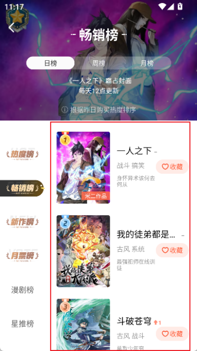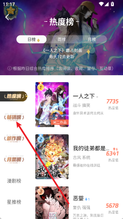 2、在排行页面中查找畅销榜分类并点击进入,查看当前热门漫画作品列表。