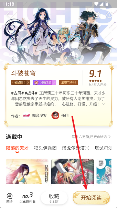 4、进入漫画详情页面后,找到开始阅读按钮并点击,进入漫画阅读界面。