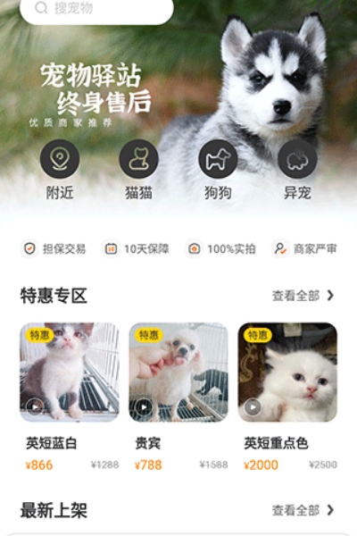 1、进入首页快速浏览宠物特惠、新上架品种与精选推荐内容,第一时间锁定心仪宠物。