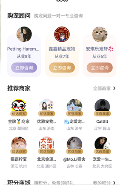 2、点击「发现」页面发起一对一购宠顾问咨询,针对品种选择与养护疑问获取专项解答。