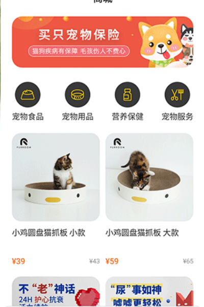 3、进入「商城」选购宠物食品、日常用品与保健品,并可预约专项宠物服务满足养宠需求。