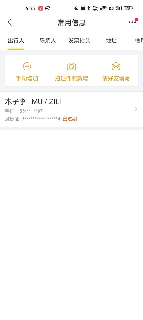 4、进入常用信息列表后,选择需要删除的出行人信息,向右滑动对应条目即可完成删除操作。