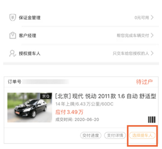 8、完成付款后可在APP内查看车辆交易进度,过户完成后由交付经理联系提车,无法到场可授权提车人携带证件办理提车手续。