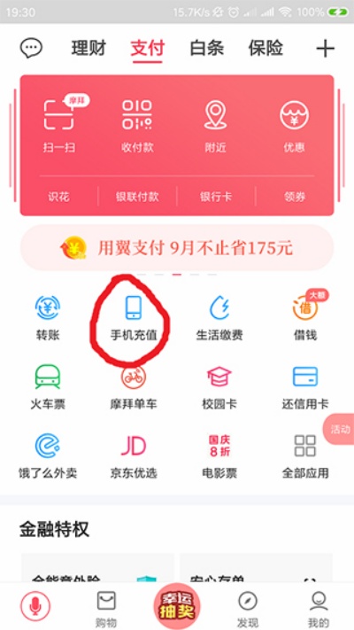1、打开翼支付最新版进入首页界面,在功能入口中找到并点击“手机充值”选项进入充值页面。