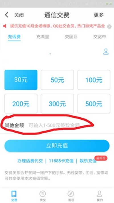 3、在充话费页面的“其他金额”栏位输入需要充值的金额,并点击“立即充值”按钮提交订单。