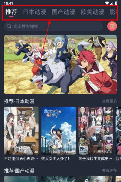 1、在手机上打开ci哩ci哩app,进入软件主界面后,可浏览推荐、国产动漫等多个栏目内容,快速了解当前番剧资源分布情况。