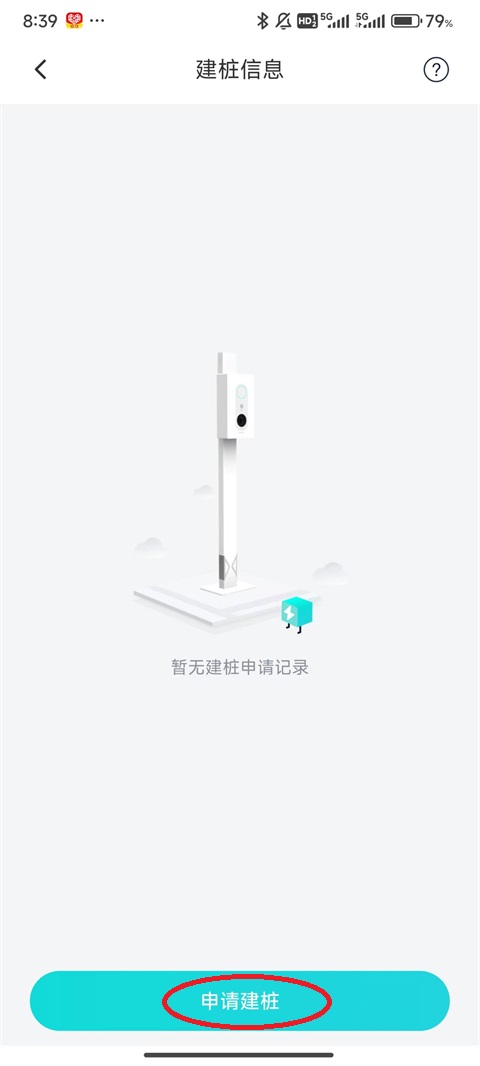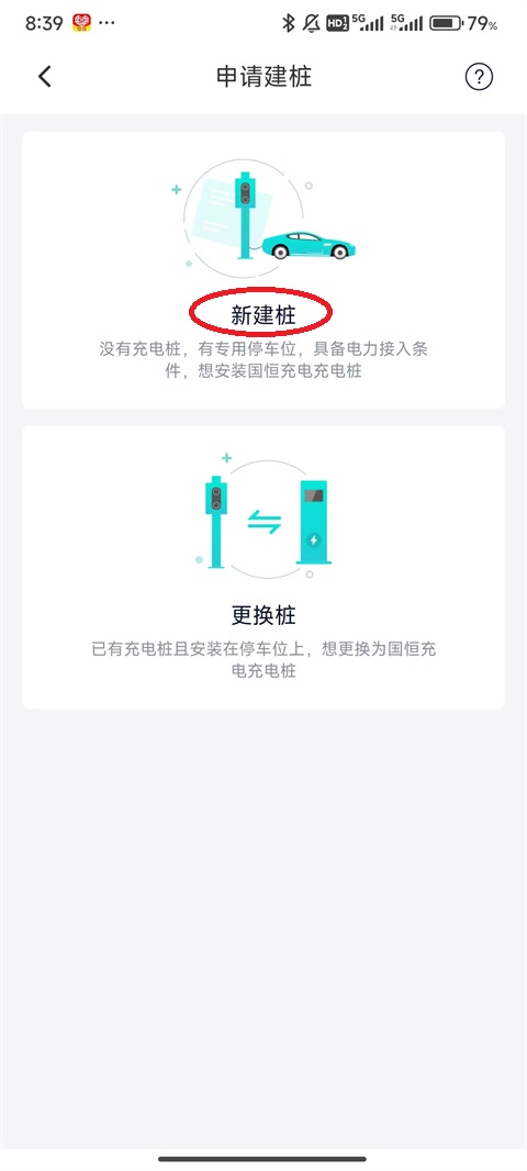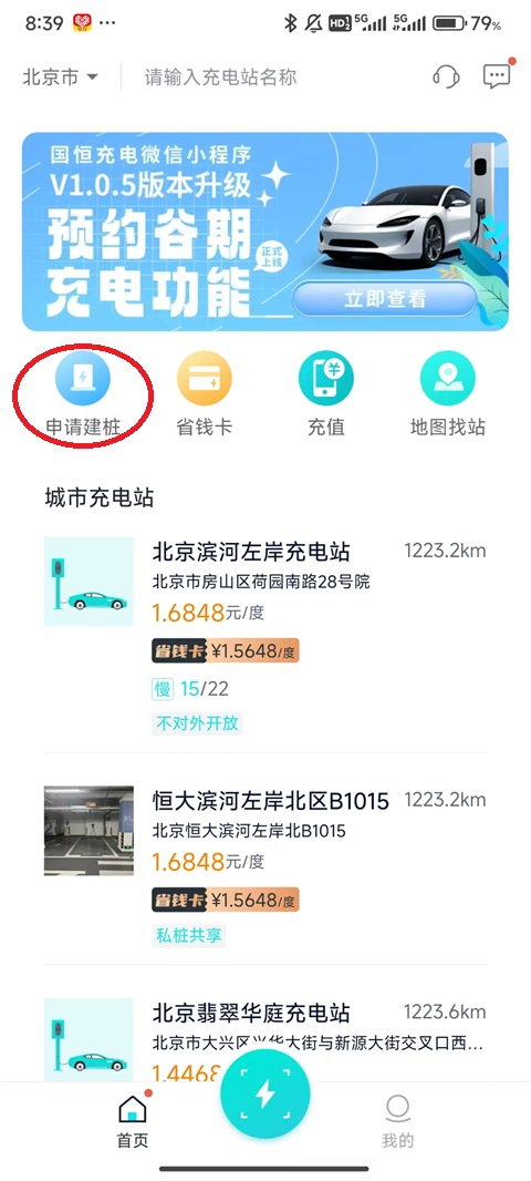 1、打开国恒充电App,在首页界面点击中间左侧的“申请建桩”入口进入申请页面。
