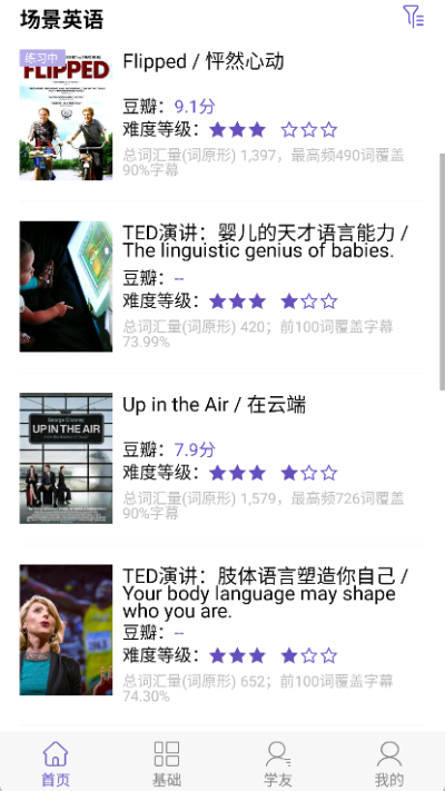 1、进入听典英语后在主界面浏览视频学习资源,选择电影片段或对话内容进入学习页面,按需开启听力训练流程。