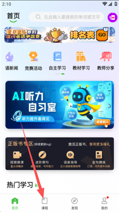 1、打开维词后进入底部导航栏“课程”入口,进入课程学习主界面,查看不同课程分类与学习内容结构。