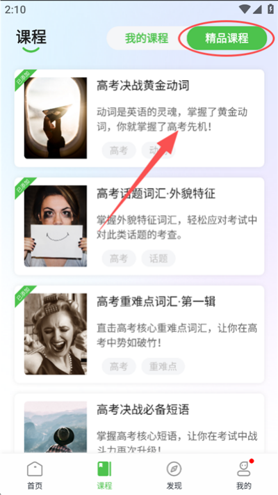 2、在课程页面点击“精品课程”,根据学习需求选择对应课程内容,例如高考词汇专项等学习模块。