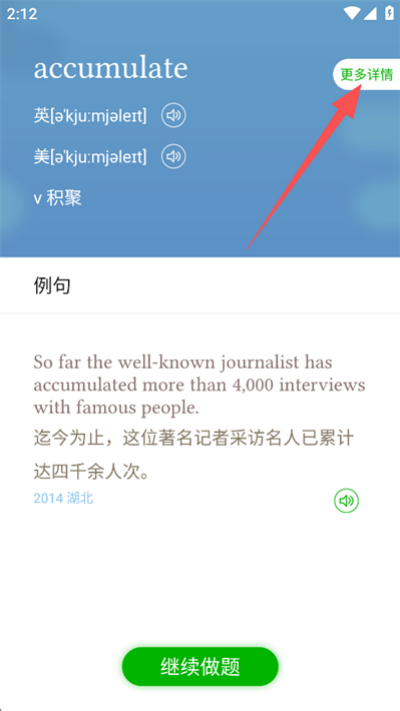 6、需要深入学习时点击“更多详情”进入单词详情页面,查看完整解释与用法说明内容。