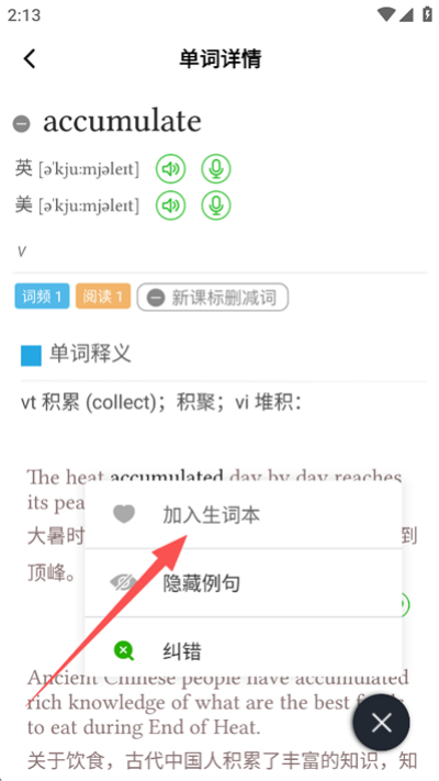 7、在详情页点击“加入生词本”,将重点词汇收藏记录,便于后续复习与巩固记忆使用