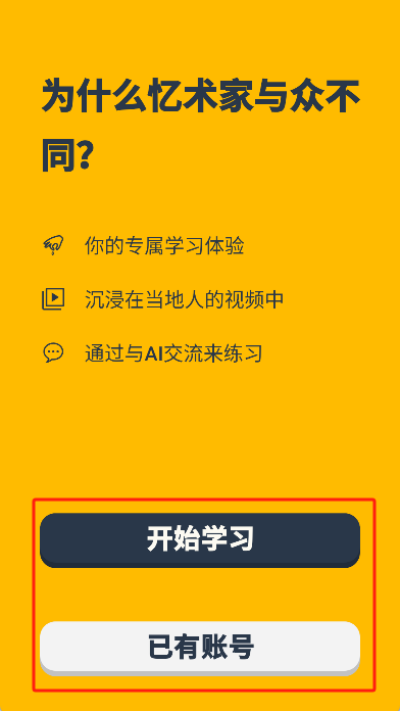 1、打开忆术家应用后进入登录界面,可选择已有账号登录或点击“开始学习”创建新学习账号进入系统。