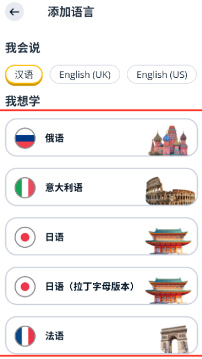 2、完成登录或注册后进入语言选择页面,根据学习需求选择目标语言进入对应学习课程与训练体系。