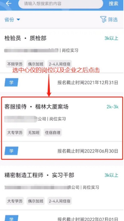 1、打开职校家园实习备案APP后进入底部导航栏“实习备案”入口,点击“前往报名”进入实习岗位选择页面,选择目标企业岗位信息进入详情界面。