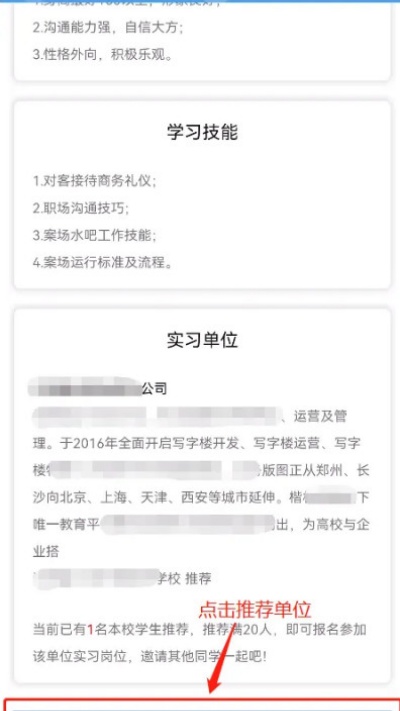 2、进入岗位详情页后查看岗位信息并滑动至页面底部,若本校推荐人数未达到20人,点击“推荐单位”进行推荐流程操作,等待人数达标后再进入下一步。