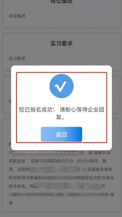 5、完成确认后等待实习备案系统反馈结果,提示报名成功后进入企业审核阶段,等待后续实习安排确认。