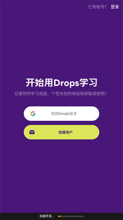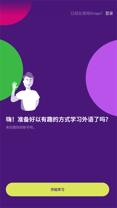 1、打开Drops应用后进入启动界面,点击“开始学习”选项进入语言学习流程与功能选择页面。