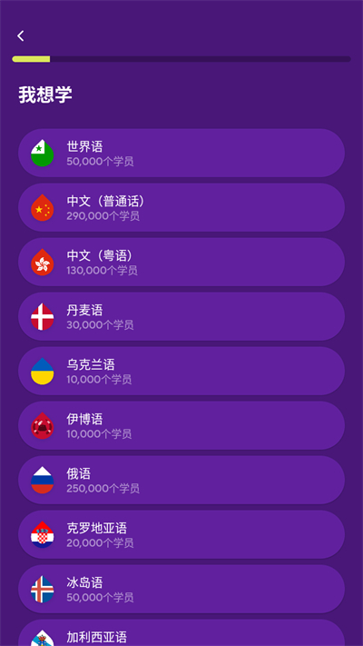 2、进入语言选择界面后,根据学习需求选择目标语言类型,进入对应词汇学习与训练模块。