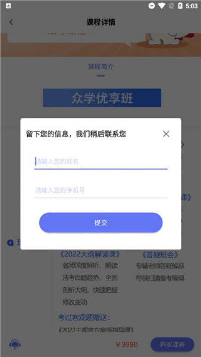 4、确认课程后点击下方“购买课程”按钮,填写真实信息并点击“提交”完成课程购买与学习开通流程。