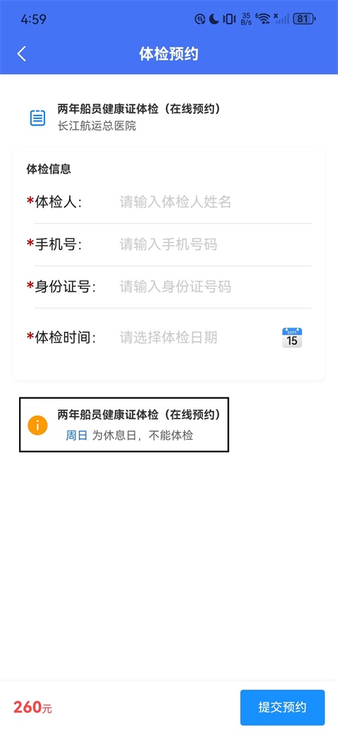 4、进入体检预约页,填写信息并选择日期,确认后提交即可完成预约,可在App内查看进度与通知。