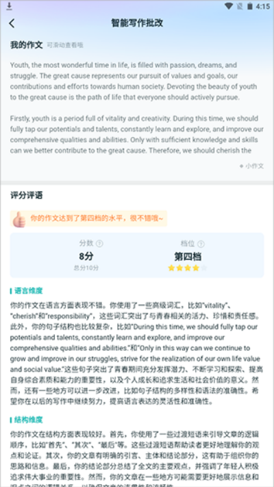 3、批改完成后可查看作文评分结果与详细评语内容,用于分析写作问题与优化表达能力。