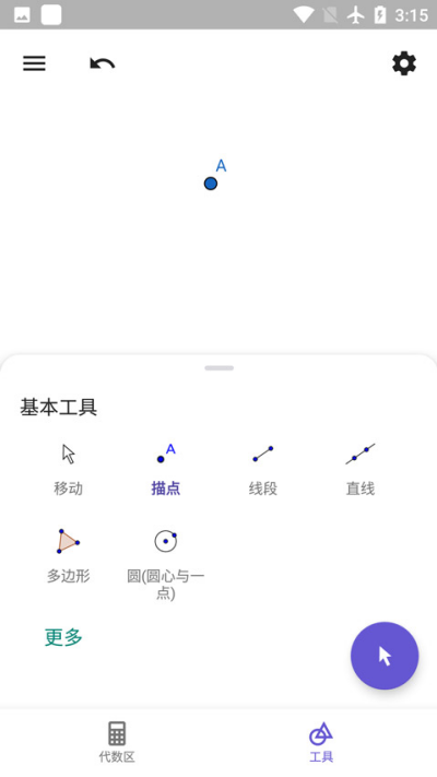 2、在工具区域选择相应几何构造工具,可用于绘制点、线、多边形等图形对象,实现几何图像的构建与编辑操作。