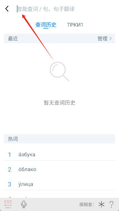 1、进入外研社俄语词典后,可在搜索框输入汉语或俄语内容进行单词检索与快速查询。