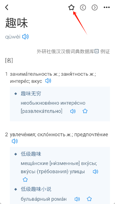 3、进入单词详情页后,点击上方收藏标识即可将该单词加入生词本,方便后续复习与巩固学习。