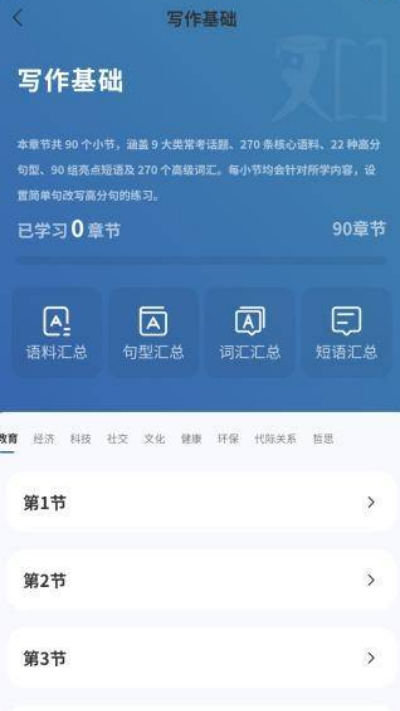 4、基础阶段学习可进入写作基础模块,查看语法讲解与短句训练内容进行系统化学习与巩固。