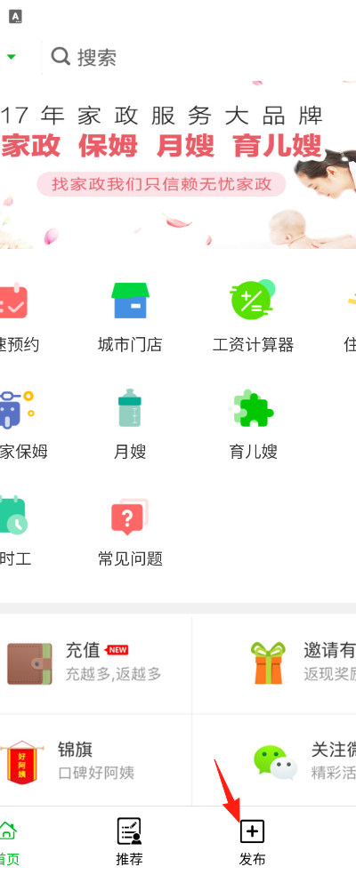 1、进入应用后,点击底部菜单栏中的“发布”功能入口。