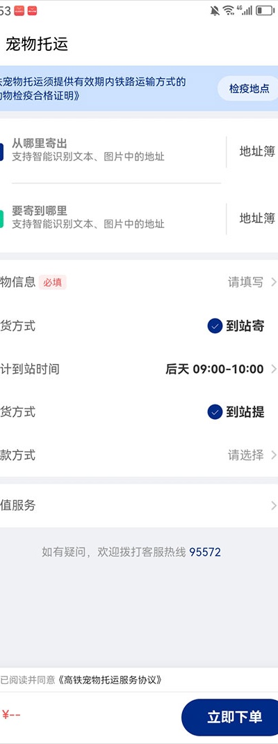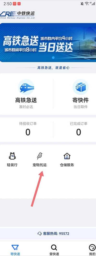 1、进入中铁快运App寄快递页面,点击【宠物托运】入口。