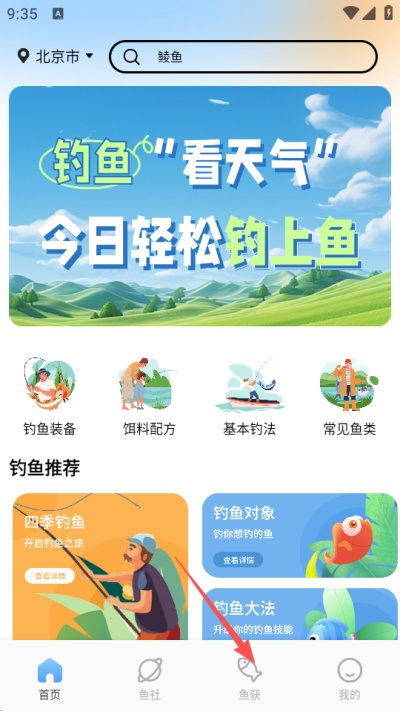 1、打开小鱼钓记软件进入首页,在底部导航栏中找到“鱼获”选项并点击,进入鱼获记录页面查看相关内容。