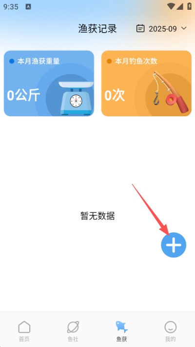 2、进入鱼获界面后点击页面中的“+”按钮,按照提示新建一条钓鱼记录,准备填写相关信息。