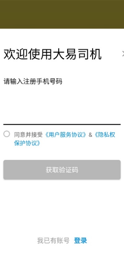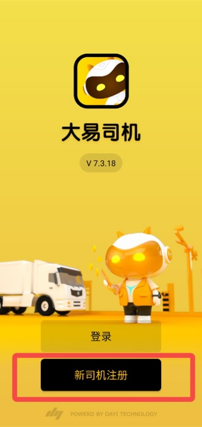 1、打开大易司机App进入主界面后,点击【新司机注册】按钮进入注册流程页面。