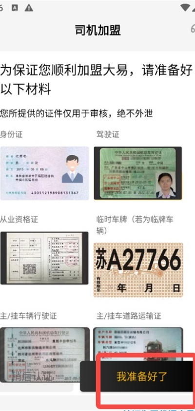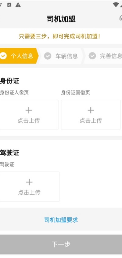 4、根据系统提示上传身份证、驾驶证及车辆证件照片,提交审核后完成注册流程。