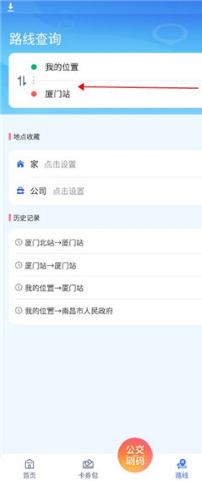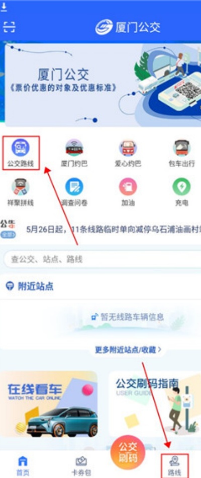 1、打开APP后,在首页点击上方的【公交路线】或下方的【路线】入口,进入路线查询界面。