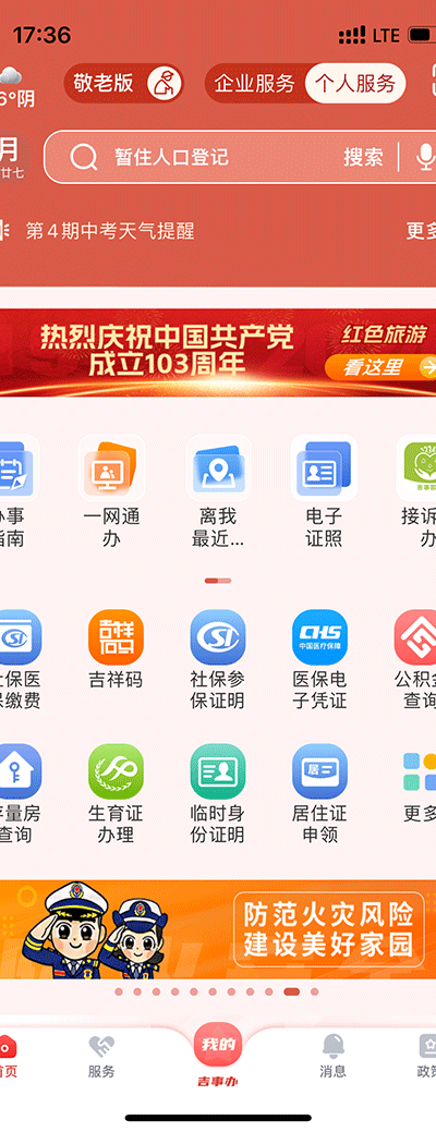 1、打开 吉事办App 后进入首页,即可查看办事指南、电子证照、社保医保缴费、公积金查询等常用功能模块。