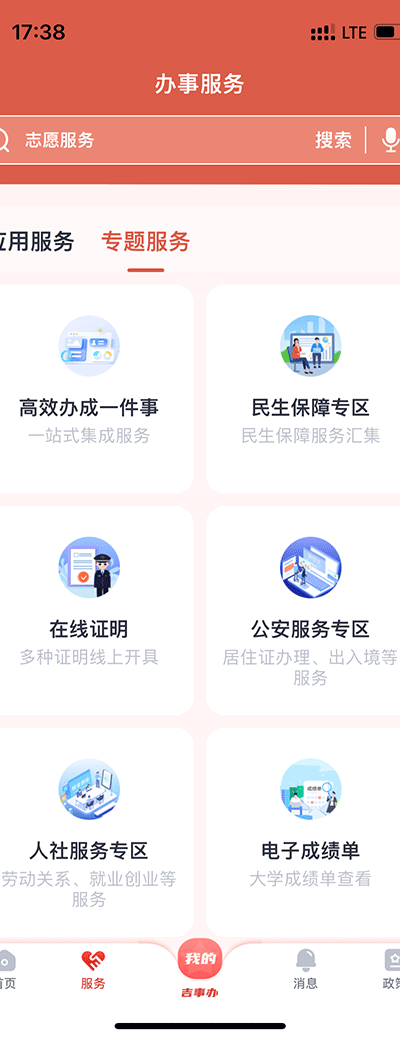 2、在服务页面中,用户可以通过搜索快速定位所需政务事项,同时还能使用专题服务功能进行分类办理。