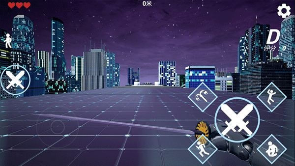 2、右侧区域为攻击、潜行、跳跃、极速跑等操作按钮,上方显示当前跑动里程数,通过滑动左下角轮盘控制角色移动开始跑酷。