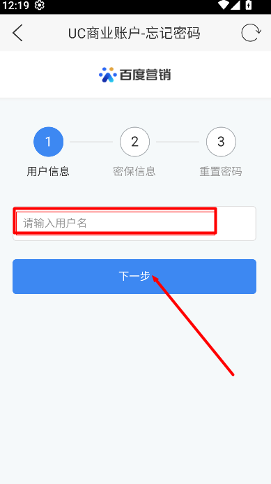 根据系统提示输入注册时使用的用户名或手机号,点击“下一步”。